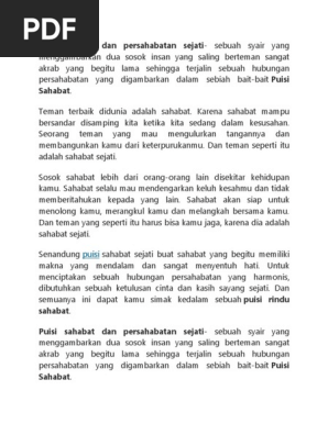 Puisi sahabat sejati mp3 duration 3:37 size 8.28 mb / masigit official 1. Sebelum lebih lanjut, kita harus cari tau pengertian sahabat ini. Puisi sahabat karya kahlil gibran. 0 ratings0% found this document useful (0 votes). Mungkin jauh, mungkin hilang komunikasi namun sahabat sejati akan selalu hidup dalam hati.